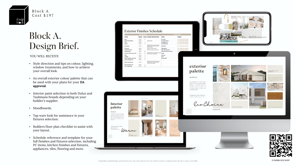 Welcome to D.SIGN BLOCK, Your digital designer for your online design selection. Her you will discover your overall look, style direction and colour palette just by completing our digital design questionnaire. Personally curated by award-winning Designer, Draftsperson and Property Stylist Kassandra Richards. This is an excellent foundation for your build or renovation. By completing this, you will instantly receive your design brief with your exterior palette that can be used with plans for DA APPROVAL and much more.